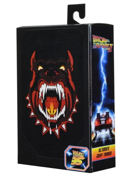 In Back to the Future Part 2, Marty and Doc experience the adventure of a lifetime in an unlikely time machine as they travel to the past, present, and future, setting off a time- shattering chain reaction that disrupts the space- time continuum! Standing approximately 7” tall, this Ultimate Griff Tannen figure is a menace! Includes telescoping bat, interchangeable head, hoverboard, and flight stand accessories. Display- friendly window box packaging with opening front flap