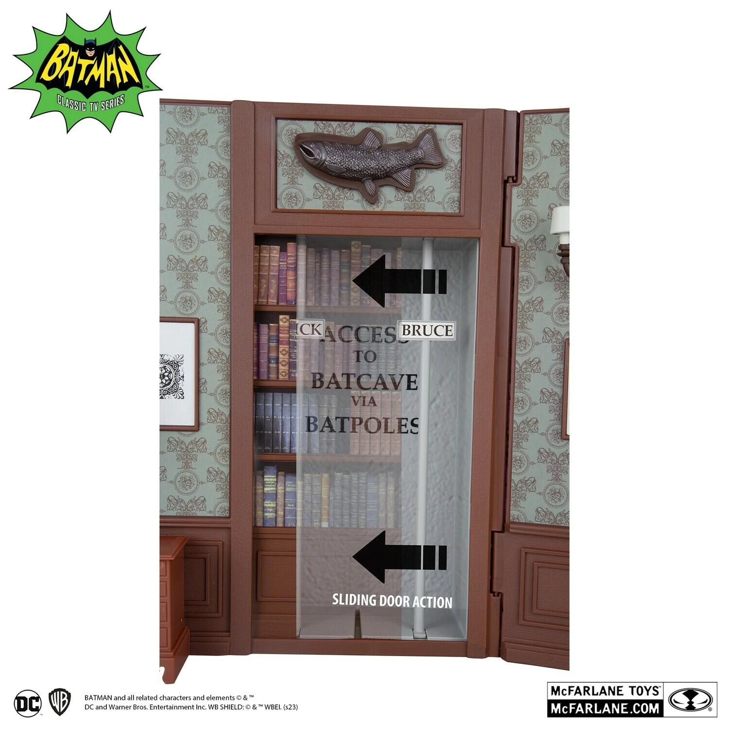 Stately WAYNE MANOR™ is the luxurious home of millionaire playboy BRUCE WAYNE™ and his faithful ward DICK GRAYSON™. When trouble strikes, BRUCE and DICK become the heroic BATMAN™ and ROBIN™, a secret known only to their dutiful butler, ALFRED PENNYWORTH™. GOTHAM CITY™ police commissioner JIM GORDON™ contacts BATMAN directly using the red “BAT-PHONE,” hidden in BRUCE’S private library. When the “BAT-PHONE” flashes and beeps, ALFRED answers COMMISSIONER GORDON’S call for assistance and alerts BRUCE and DICK. Activating a button hidden in the bust of William Shakespeare, BRUCE reveals the secret entrance to the BATCAVE™, concealed behind the bookcase. The DYNAMIC DUO™ slide down the ”Bat-poles” to the BATCAVE, ready to bring justice to GOTHAM CITY!