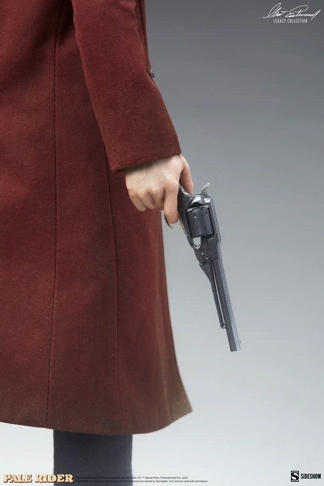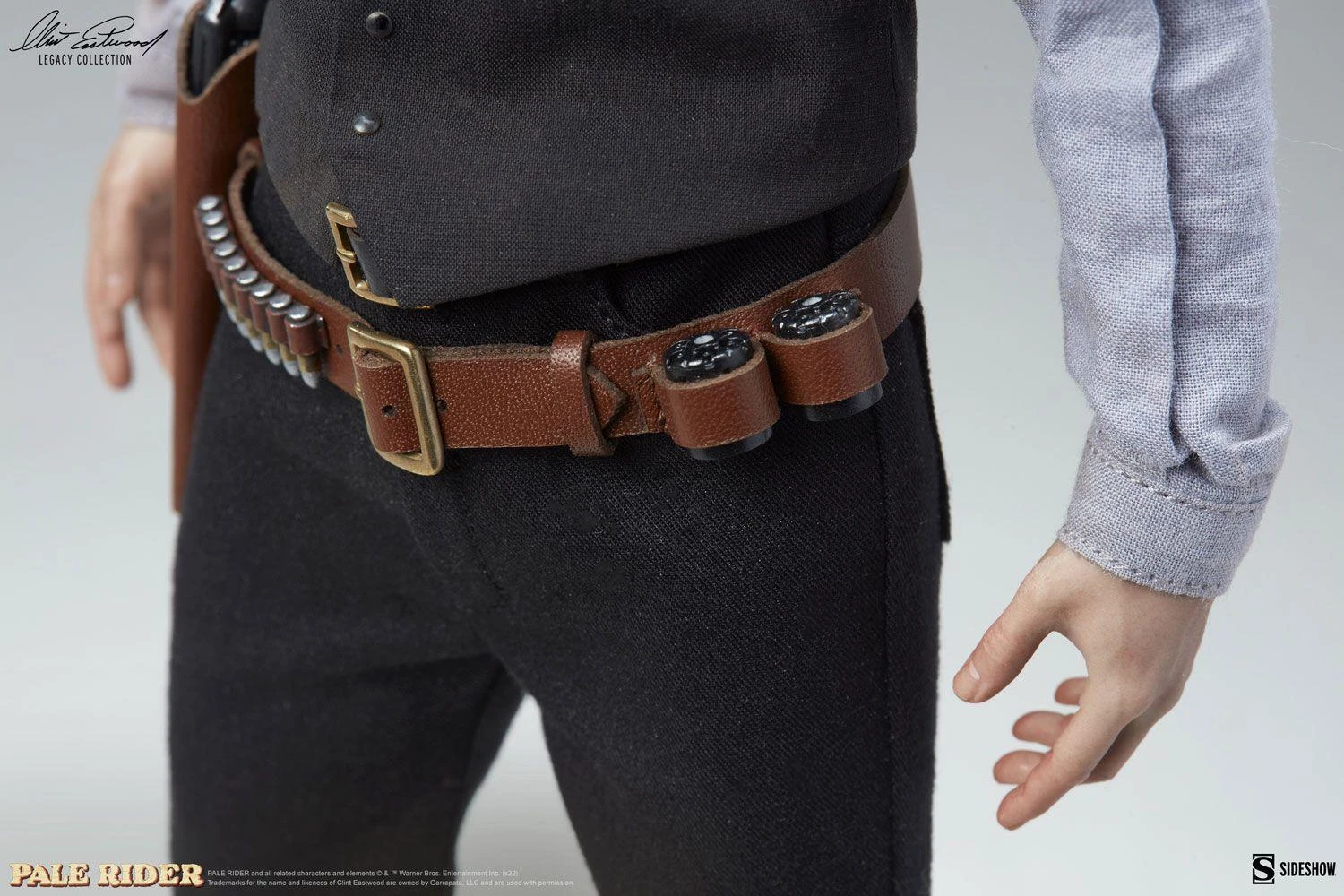 Based on Clint Eastwood’s appearance in the classic Western film Pale Rider, the Preacher Sixth Scale Figure features a carefully crafted portrait of the lone horseman with his iconic steely gaze and a non-removable hat. He also wears a custom-tailored fabric costume consisting of his weathered red duster, a black buttoned vest, a collared dress shirt, a neckerchief, and black pants. A faux-leather bullet belt and sculpted boots with spurs complete the Preacher’s signature look.