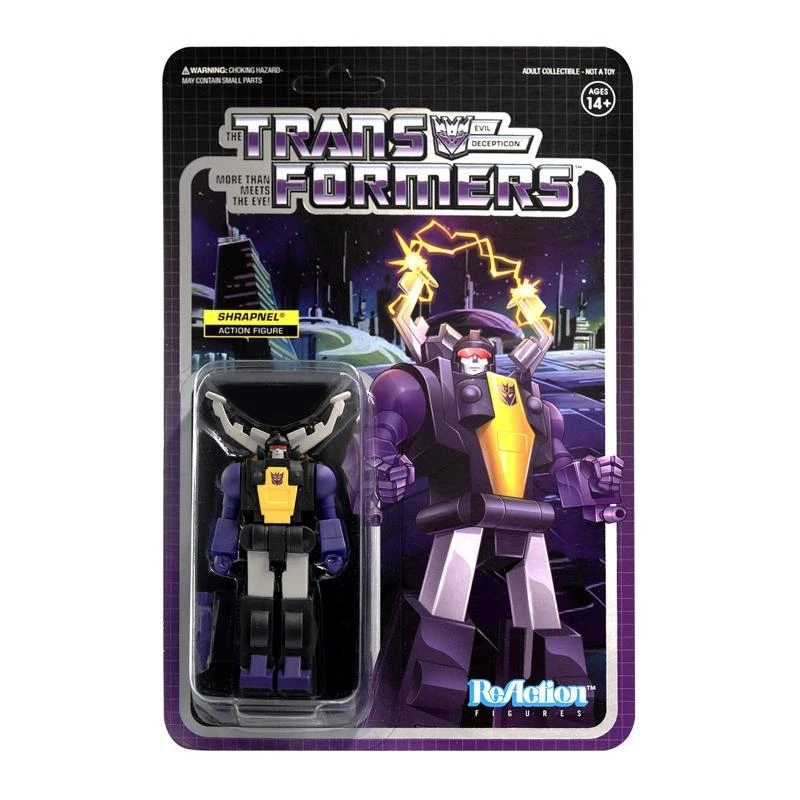 “Robots in disguise!” The Super7 x Transformers collaboration expands as the Autobots and Decepticons join the 3.75-inch ReAction Figure world! Shrapnel, the master of electricity for the Decepticons, comes with Ion Blaster accessory.